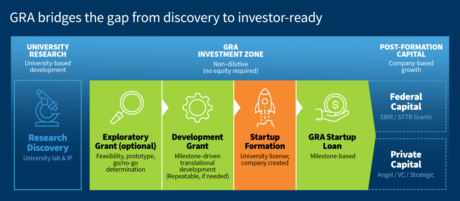 - Commercialization expertise. “Beyond the check,” GRA’s Innovation & Entrepreneurship team provides direct guidance and brings a corps of seasoned advisors to the table.