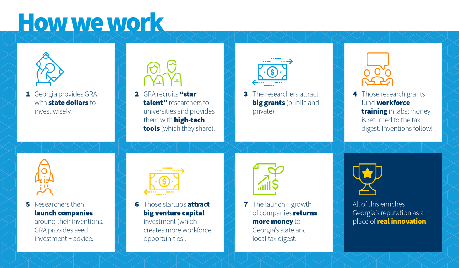 - More money coming to Georgia. GRA’s total investment of $728 million in state dollars (since 1991) has attracted $16 billion in research grants, venture capital, matching funds and other dollars. The leveraged capital is used for multiple purposes, generating a direct return to state and local tax digests.