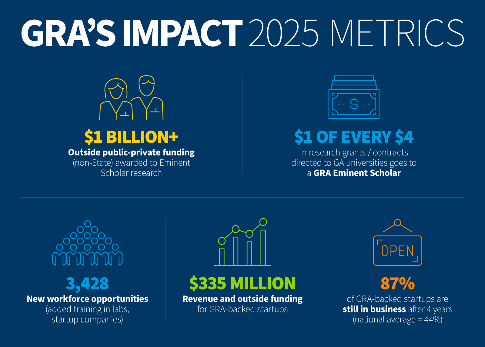 - Recruiting brilliant researchers to Georgia’s universities. They form the Academy of GRA Scholars, and they typically arrive with research teams and millions of dollars in grants. While here, they attract more private and public research dollars.